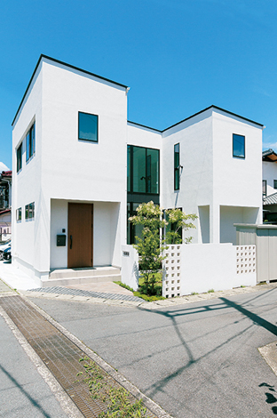 ジョリパッドの真っ白な外壁に 黒のサッシがひときわ目立つコの字型の外観 イエタテ